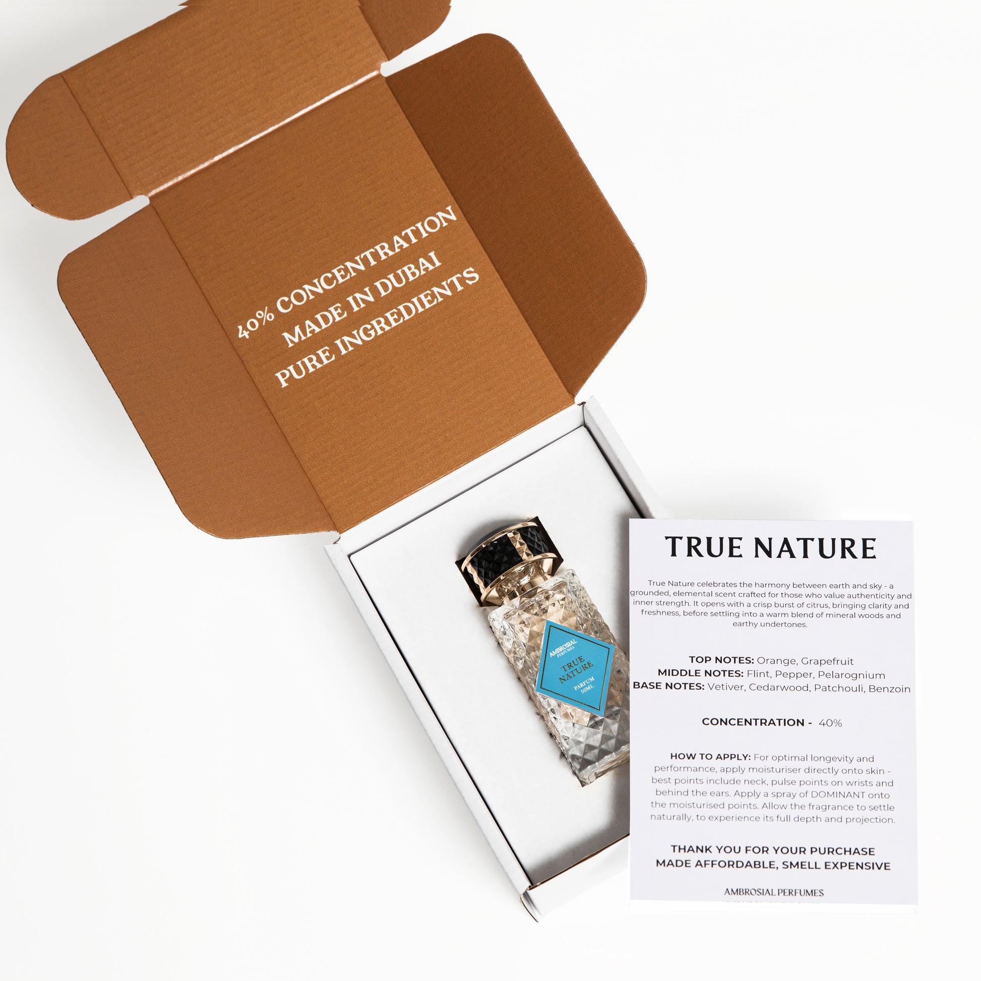 True Nature is a tribute to strength found in simplicity. It opens with a crisp burst of citrus, fresh and invigorating, evoking clarity and purpose from the very first moment. As the fragrance unfolds, mineral notes and warm spices blend seamlessly with earthy woods, creating a grounded yet refined character.
